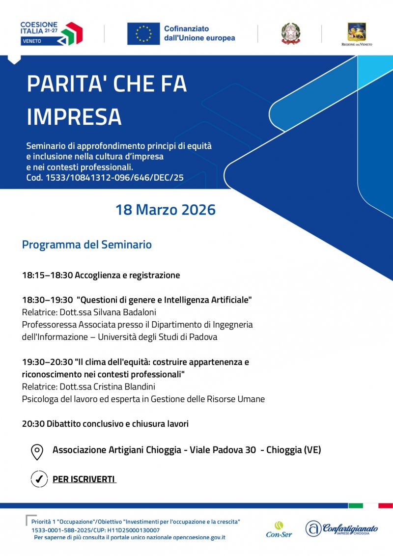 L’Associazione Artigiani di Chioggia è lieta di invitare i propri associati, i professionisti e la cittadinanza al seminario informativo che si terrà mercoledì 18 marzo 2026, presso la nostra sede in viale Padova 30.